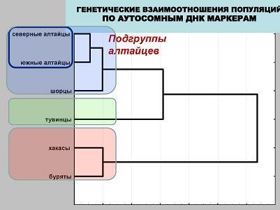 Разделение алтайцев на северноалтайскую и южноалтайскую подгруппы (промежуточный уровень) и последующий анализ свидетельствует об определённом генетическом сходстве этносов, слагающих данные общности. Дендрограмма демонстрирует объединение северных и южных алтайцев по аутосомным ДНК маркерам в единый субкластер, к которому последовательно присоединяются шорцы и тувинцы, а затем уже – субкластер «буряты – хакасы».